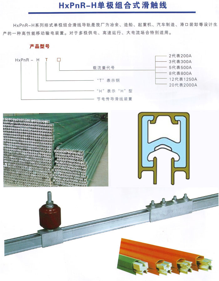 HXPnR- H系列单极组合式滑触线由H型铝合金本体导轨加压V型不锈钢滑接带、PVC绝缘外壳、外置式集电器以及悬吊、固定等组件组合而成。该产品以其设计新颖、结构合理、维护方便、使用安全等特点被广泛应用于电流较大、使用频率较高、运行速度快和环境较差的场合。