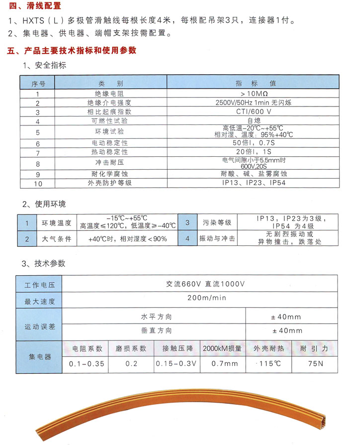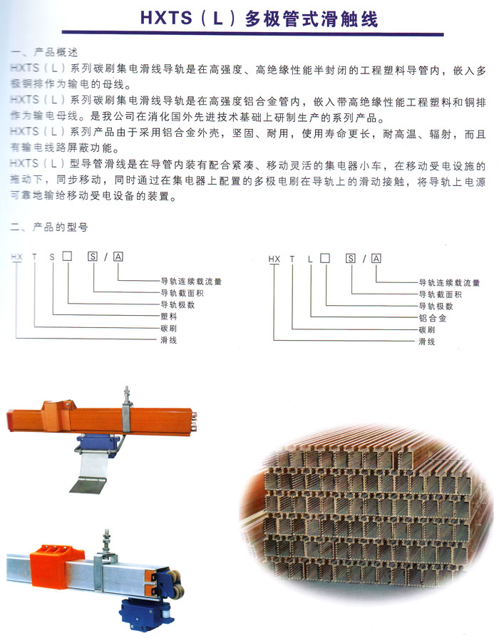 HXTS、HXTL系列多极管式滑触线由高强度工程塑料绝缘导管或铝合金保护壳、多级导电铜排、集电器以及悬吊、固定等组件组合而成。该产品以其设计紧凑、性能稳定、使用安全的特点被广泛地应用于电流较小、使用频率较高的物流自动化流水生产线以及检测线。