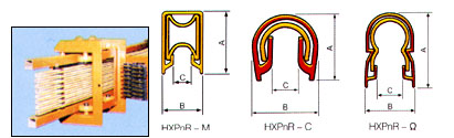HXPnR-M、HXPnR-C、HXPnR- Ω 系列单极组合式滑触线 | 型号规格 | 滑触线截面尺寸(mm) | 载流量(A) | 适配置式集电器 | A | B | C | HXPnR-M-100 | 15.2 | 9.6 | 3.8 | 100 | MJD-100-M1、MJD100-M2 | HXPnR-C-120 | 15.8 | 14.8 | 5.4 | 120 | MJD-120-C1、MJD120-C2 | HXPnR- Ω-100 | 17.8 | 12 | 6.1 | 100 | MJD-100- Ω | | 注:1、滑触线标准长度:4m。2、HXPnR-M与HXPnR-C以及HXPnR- Ω性能相同,几何形状不同。 |