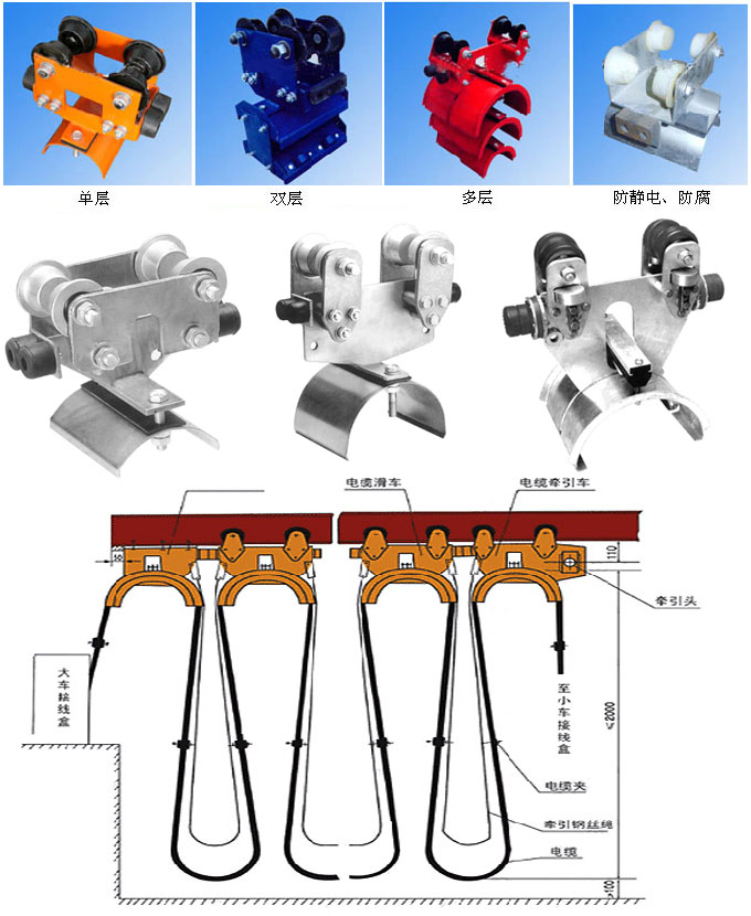 HC系列电缆滑车分为中载荷型、重载荷型、和轻载荷型,因此滑车走轮为Ф80、Ф63、Ф50的三种,承载能力≤50~150kg,每类按托板层数分为单层、双层、三层,每类中有三种形式,首端为电缆牵引车,终端为固定挂线架,中间为电缆滑车。
