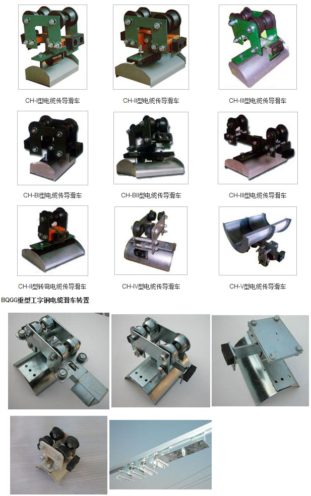 GHC型系列工字钢电缆滑车装置用于移动供电机械在移动中电缆的悬吊与移动,已广泛应用于各类起重机械中。工字钢电缆滑车该装置具有结构坚固。移动灵活。安全可靠等优点。GHC型滑车由牵收引滑车、电缆滑车、终端滑车三部分组成,牵引滑车跟随移动机械导缆(牵引)装置,每个移动机械配1个,随移动机械往返运行。中间电缆滑车将电缆悬挂在工字钢轨道范围内随牵引滑车移动,两端并装有缓冲撞头,滑车视移动长度不同而定数量。终端滑车固定在工字钢导轨末端,一般每个移动机械设置1个。工字钢电缆滑车该系列滑车分Ⅰ、Ⅱ、Ⅲ、Ⅳ、Ⅴ五种型号,如用户采用12#、14#、16#或更大号数工字钢,可在订货时注明,本厂可成套供货。